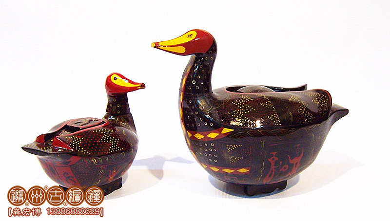 簡(jiǎn)介:鴛鴦盒為木胎其身,體分兩半,制作再粘合成,頭頸與身體則榫卯相連,故頭能自由轉(zhuǎn)動(dòng)。背上有一長(zhǎng)方形口與蓋相扣合,蓋上浮雕龍紋。整器外髹黑漆,其上用紅色和金色描繪眼、嘴、羽毛以及菱形紋等。在它的腹部還描繪了建鼓舞和撞鐘擊磬的情節(jié)畫(huà)。