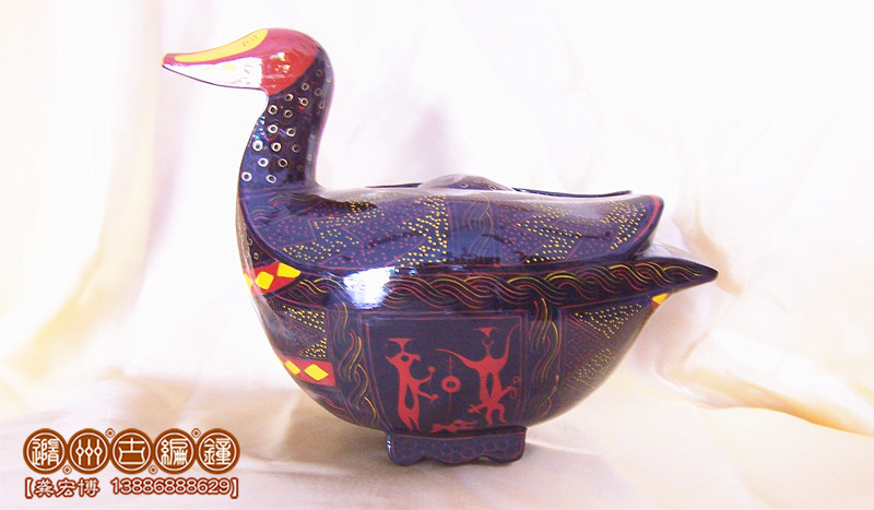 鴛鴦盒為木胎其身,體分兩半,制作再粘合成,頭頸與身體則榫卯相連,故頭能自由轉(zhuǎn)動(dòng)。背上有一長(zhǎng)方形口與蓋相扣合,蓋上浮雕龍紋。整器外髹黑漆,其上用紅色和金色描繪眼、嘴、羽毛以及菱形紋等。在它的腹部還描繪了建鼓舞和撞鐘擊磬的情節(jié)畫(huà)。考古顯示為古代宮女漆盒、木豆或胭脂盒。